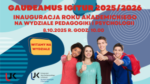 DZIEKAN Wydziału Pedagogiki i Psychologii Uniwersytetu Jana Kochanowskiego w Kielcach dr hab. Sławomir Koziej, prof. UJK ma zaszczyt zaprosić na INAUGURACJĘ ROKU AKADEMICKIEGO 2025/2026 Uroczystość odbędzie się w dniu 8 października 2025 r. o godzinie 10:00 w Auli im. Ks. Stanisława Konarskiego przy ul. Krakowskiej 11 Link do wydarzenia na żywo