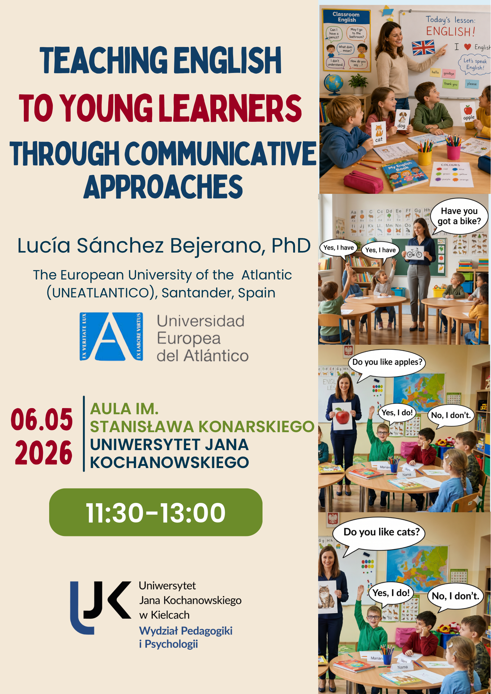 Dnia 6. maja 2026 r. w Auli im. Stanisława Konarskiego Wydziału Pedagogiki i Psychologii UJK doktor Lucía Sánchez Bejerano z The European University of the Atlantic przedstawi wykład na temat: „Teaching English to Young Learners through Communicative Approaches”. Wydarzenie stanowić będzie doskonałą okazję do pogłębienia wiedzy z zakresu metodyki nauczania języka angielskiego oraz refleksji nad rolą nauczyciela w organizowaniu środowiska sprzyjającego uczeniu się języka w sposób naturalny i angażujący. Początek o godzinie 11.30.